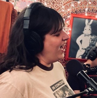 Amy Scaffidi aka Kans Gass, singer for Tenacious Double D, a parody cover tribute to Tenacious D, appearing on the Worst Little Podcast, 03/20/2023