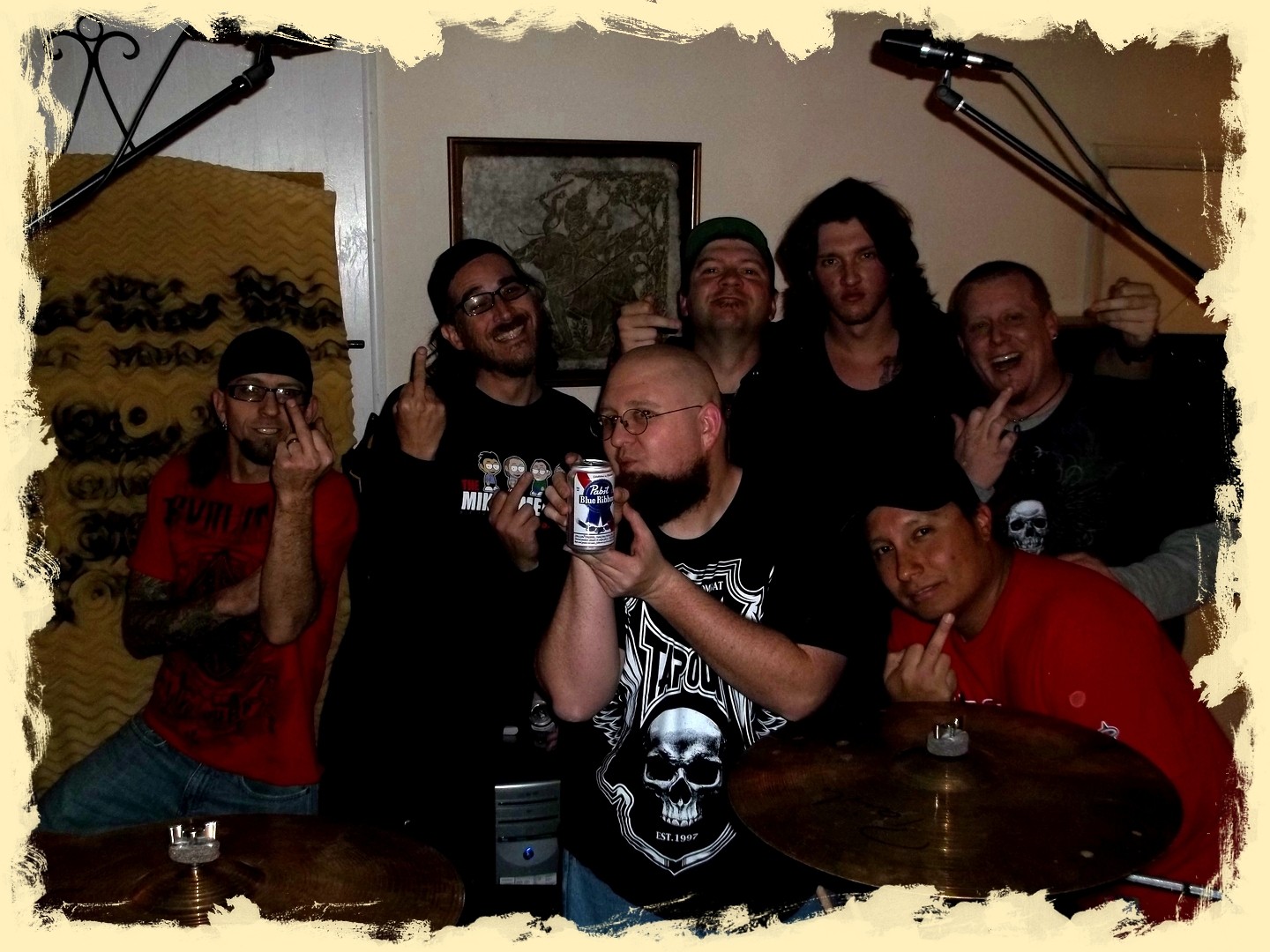(back, from left) Casey Simmons, Nick Ramirez, Josh Martin, Cameron Shirey and Derek “Dee” Jennings, (front) Aaron “Fester” Webb and Adrian “Ace” Ybarra – all flipping off the camera on the Worst Little Podcast in the World 2013 11 11 after their last performance at Dogwater Studios.