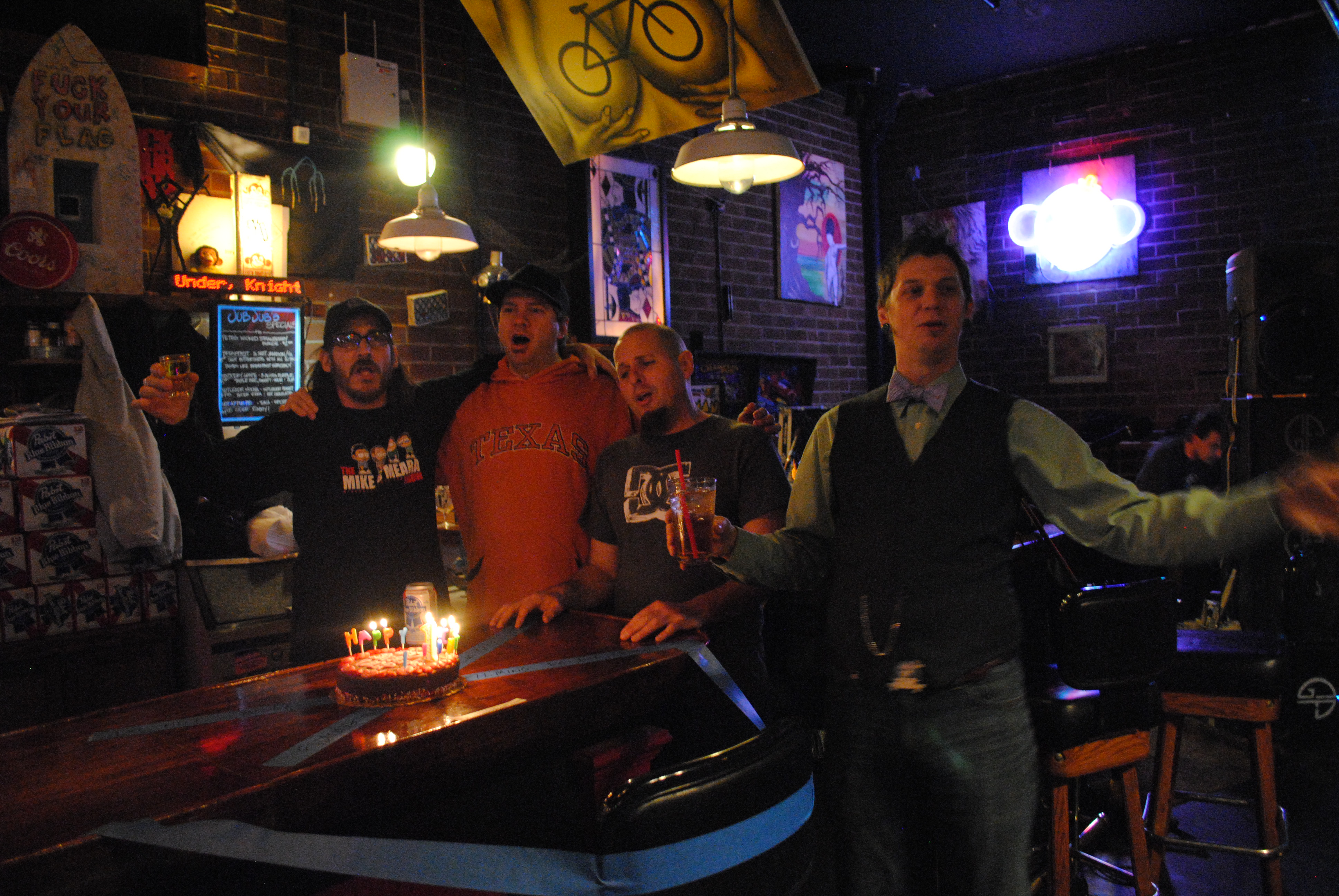 Nick Ramirez, Josh Martin, Rick Spagnola and Rory dowd singing the birthday song at the Worst Little Podcast 1st Anniversary Live Show, 1/20/12
