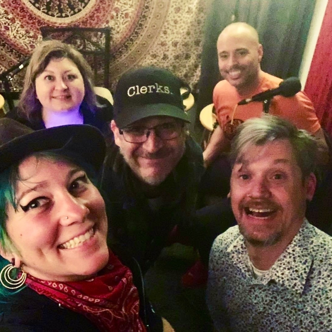 Jessi ‘Sprocket’ Janusee, Kadillac Kim, Nick Ramirez, Eric Marks and Reverend Rory Dowd in a group photo after recording S12 E10 of the Worst Little POdcast