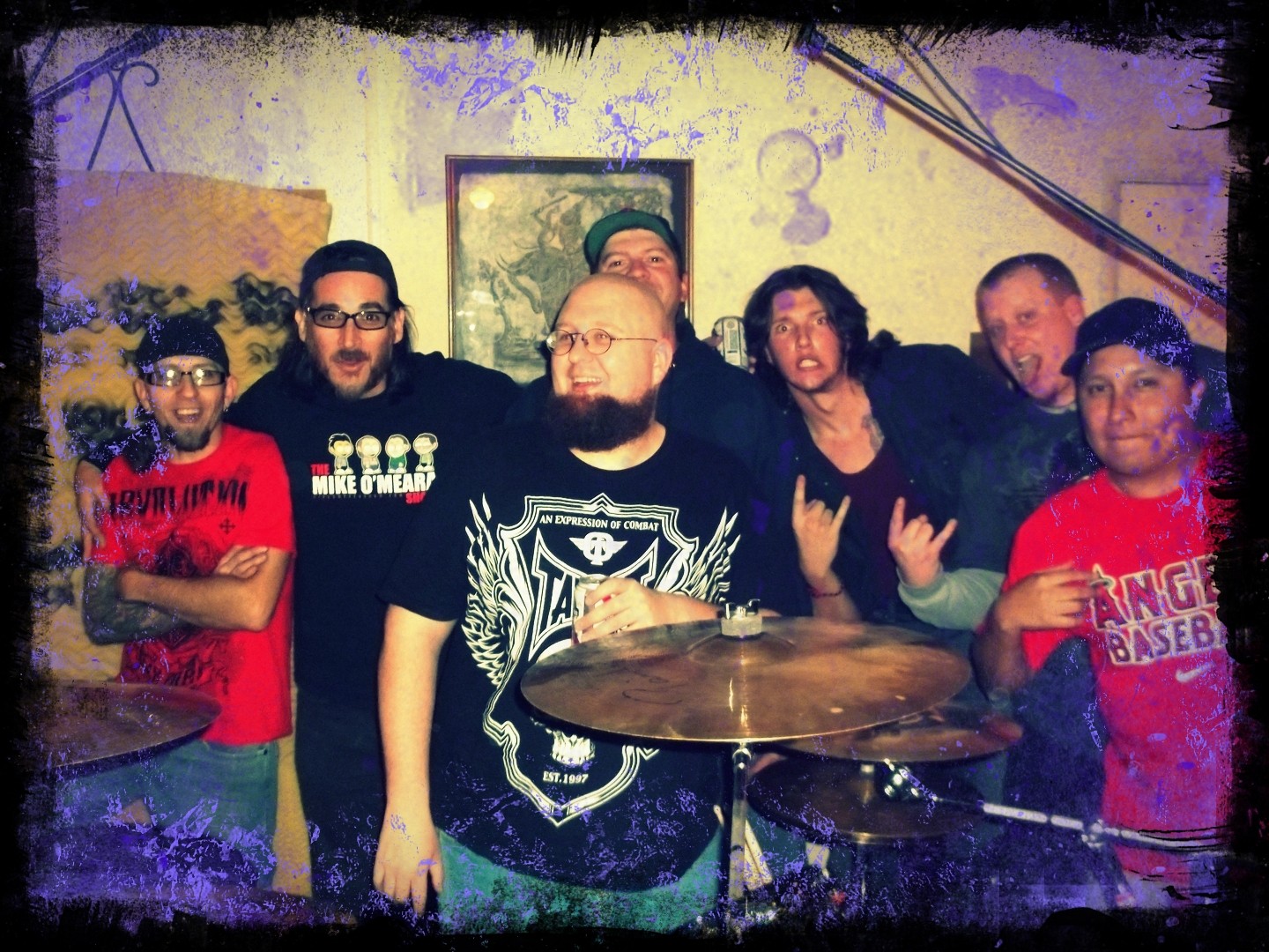 (back, from left) Casey Simmons, Nick Ramirez, Josh Martin, Cameron Shirey and Derek “Dee” Jennings, (front) Aaron “Fester” Webb and Adrian “Ace” Ybarra on the Worst Little Podcast in the World 2013 11 11 after their last performance at Dogwater Studios.