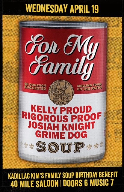 Flyer for Kadillac Kim’s Family Soup Birthday Benefit – 40 mile saloon – Wed 4/19/23 – featuring performances by Grimedog, Josiah Knight, Rigorous Proof, and Kelly Proud. Doors at 6 / Music at 7 – $5 suggested donation, grilling food on the patio