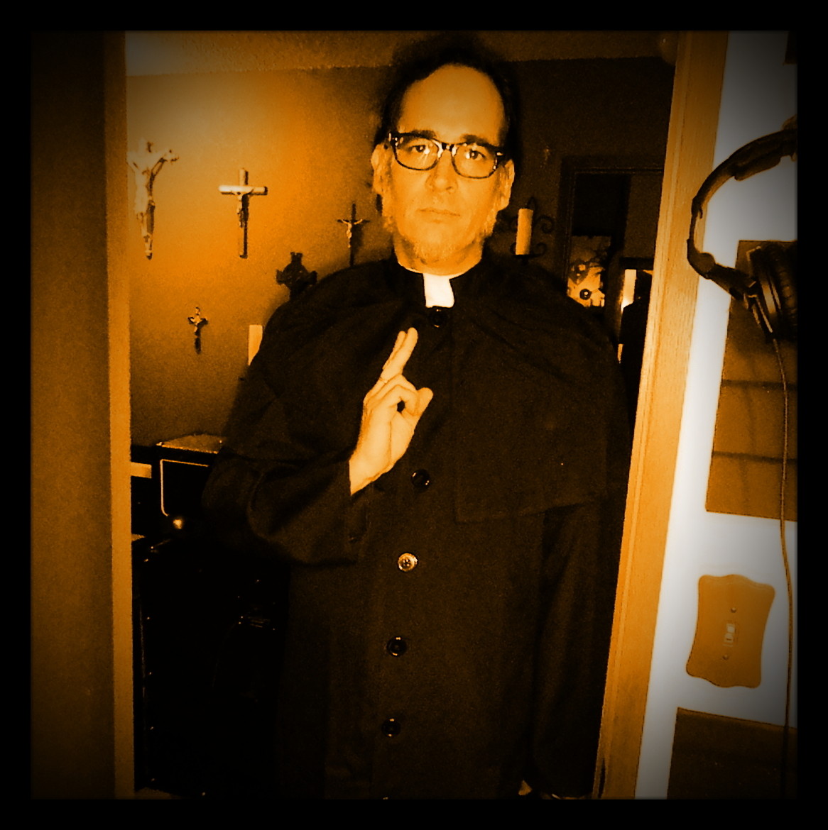 Host Nick Ramirez in his priest garb at Dogwater Studios for the Worst little Podcast.