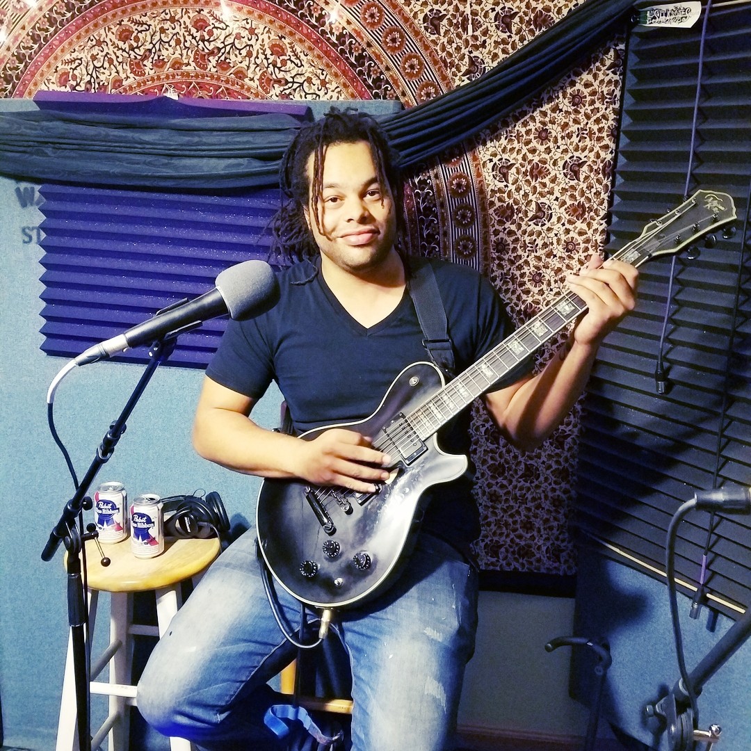 Dizzle of Reno metal band Qarin recording for the Worst Little podcast at Dogwater Studios.