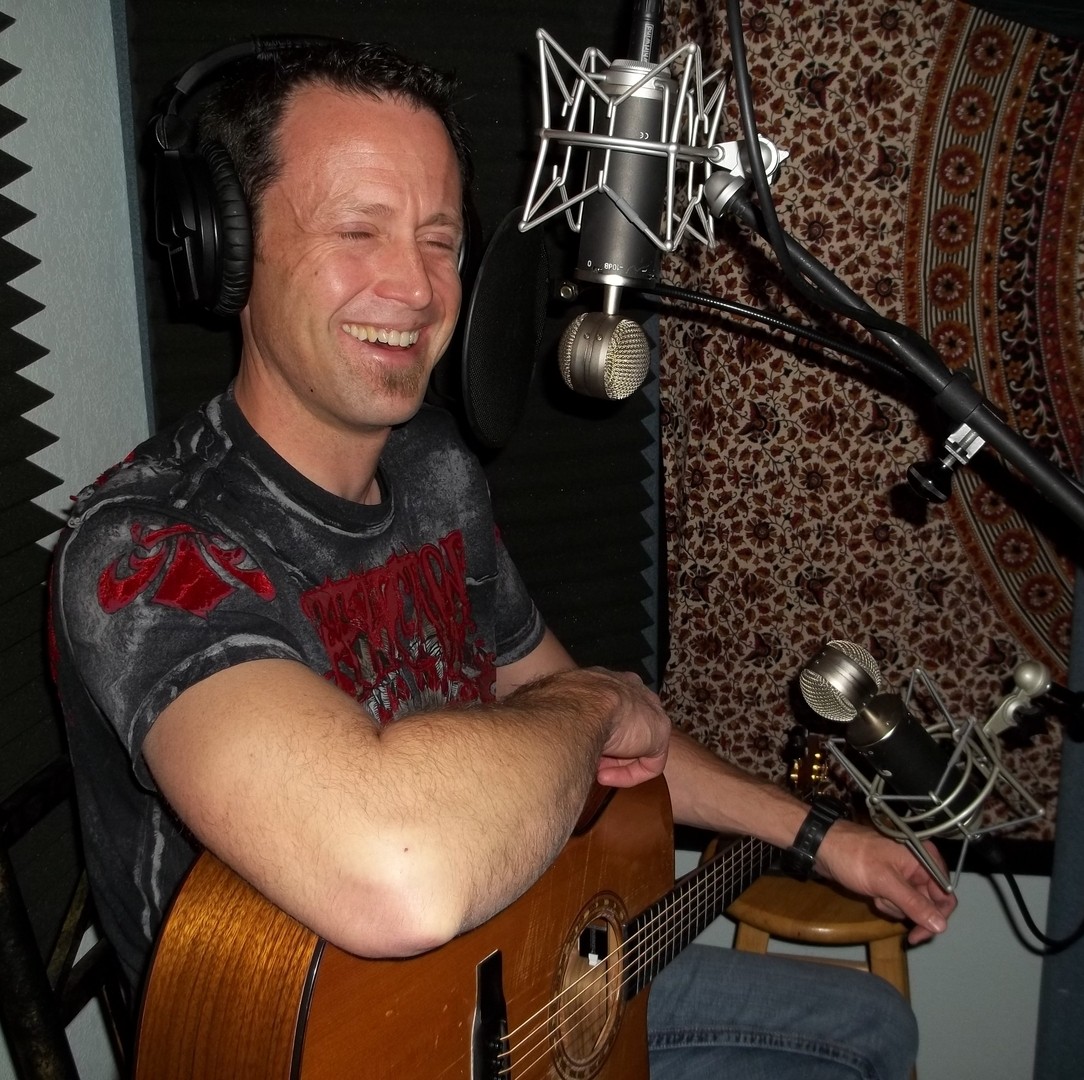Todd Ballowe, Reno singer/songwriter, laughing while sitting with guitar